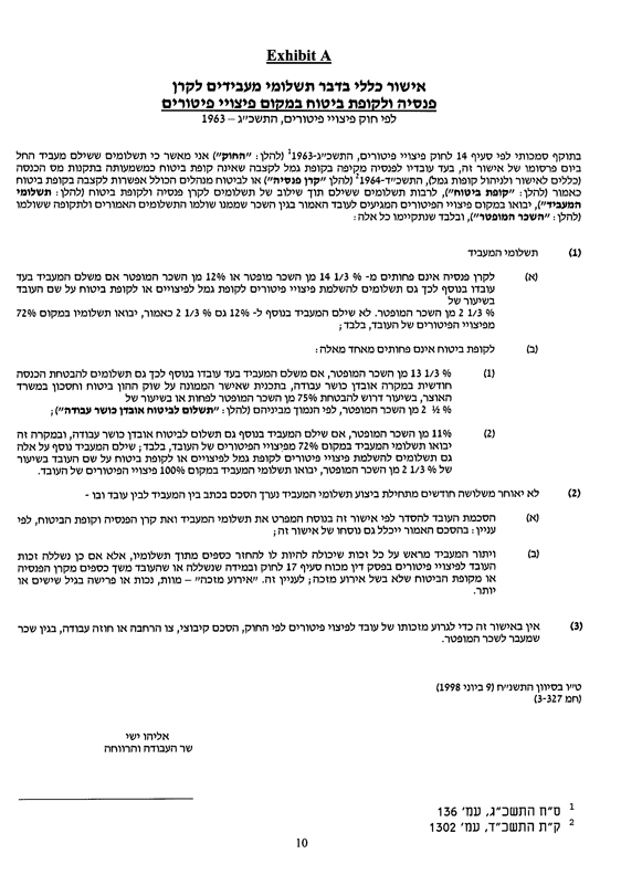 | (iii) | Sub-Sections (i) and (ii) are in accordance with Section 14 of the Severance Compensation Act, 1963 and the General Approval, a copy of which is attached hereby to this Schedule A as Exhibit A. |