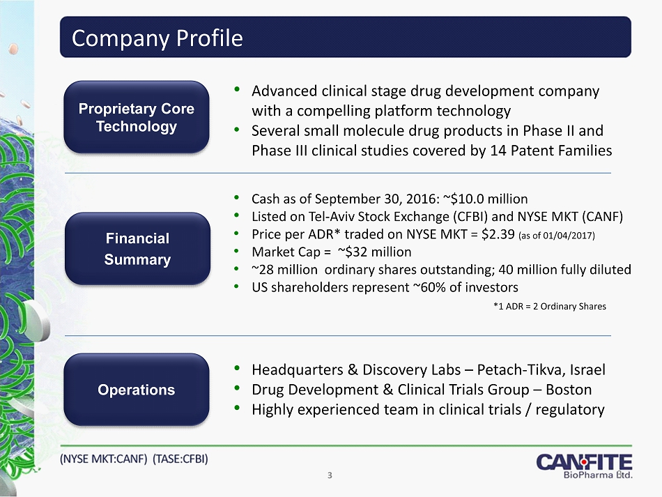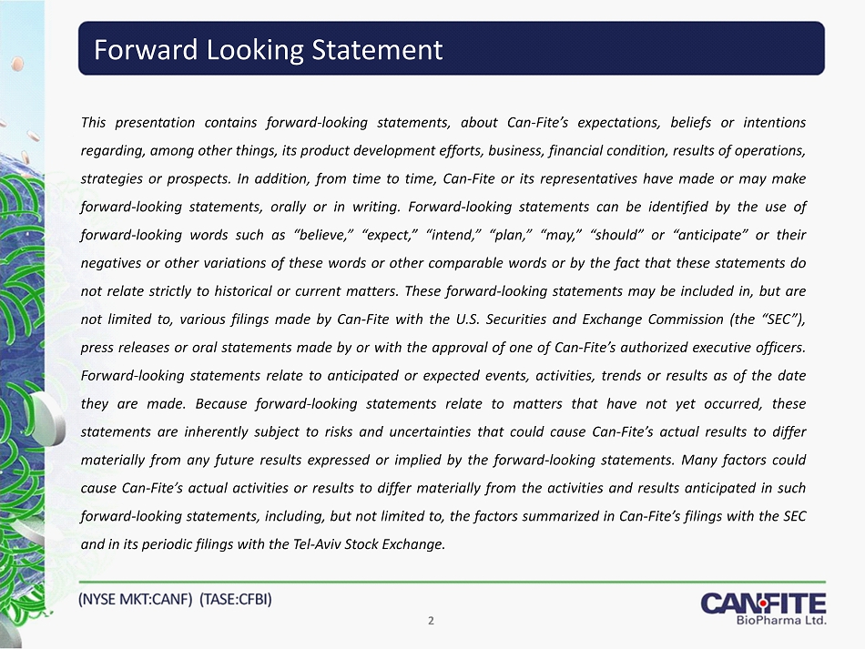 This presentation contains forward - looking statements, about Can - Fite’s expectations, beliefs or intentions regarding, among other things, its product development efforts, business, financial condition, results of operations, strategies or prospects . In addition, from time to time, Can - Fite or its representatives have made or may make forward - looking statements, orally or in writing . Forward - looking statements can be identified by the use of forward - looking words such as “believe,” “expect,” “intend,” “plan,” “may,” “should” or “anticipate” or their negatives or other variations of these words or other comparable words or by the fact that these statements do not relate strictly to historical or current matters . These forward - looking statements may be included in, but are not limited to, various filings made by Can - Fite with the U . S . Securities and Exchange Commission (the “SEC”), press releases or oral statements made by or with the approval of one of Can - Fite’s authorized executive officers . Forward - looking statements relate to anticipated or expected events, activities, trends or results as of the date they are made . Because forward - looking statements relate to matters that have not yet occurred, these statements are inherently subject to risks and uncertainties that could cause Can - Fite’s actual results to differ materially from any future results expressed or implied by the forward - looking statements . Many factors could cause Can - Fite’s actual activities or results to differ materially from the activities and results anticipated in such forward - looking statements, including, but not limited to, the factors summarized in Can - Fite’s filings with the SEC and in its periodic filings with the Tel - Aviv Stock Exchange . Forward Looking Statement 2