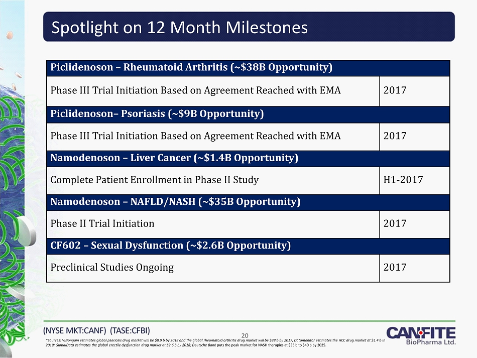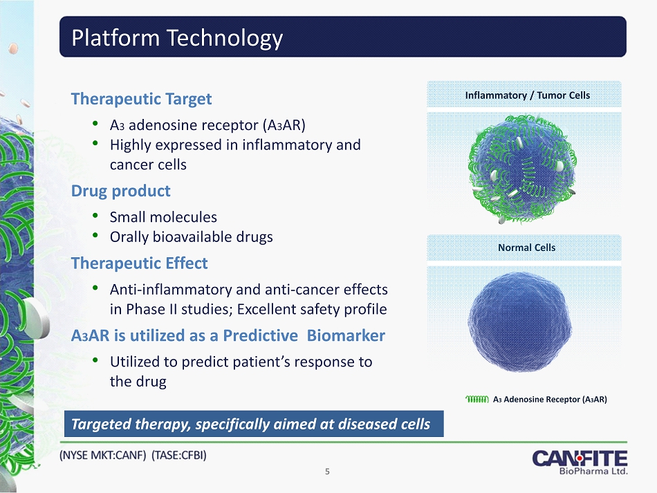 3 Company Profile Operations Financial Summary Proprietary Core Technology • Headquarters & Discovery Labs – Petach - Tikva, Israel • Drug Development & Clinical Trials Group – Boston • Highly experienced team in clinical trials / regulatory • Advanced clinical stage drug development company with a compelling platform technology • Several small molecule drug products in Phase II and Phase III clinical studies covered by 14 Patent Families • Cash as of September 30, 2016: ~$10.0 million • Listed on Tel - Aviv Stock Exchange (CFBI) and NYSE MKT (CANF) • Price per ADR* traded on NYSE MKT = $2.39 (as of 01/04/2017) • Market Cap = ~$32 million • ~28 million ordinary shares outstanding; 40 million fully diluted • US shareholders represent ~60% of investors *1 ADR = 2 Ordinary Shares 3