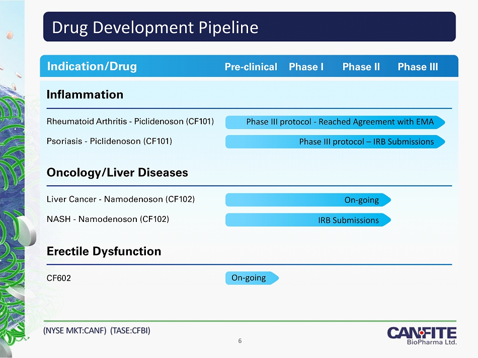 Therapeutic Target • A 3 adenosine receptor (A 3 AR ) • Highly expressed in inflammatory and cancer cells Drug product • Small molecules • Orally bioavailable drugs Therapeutic Effect • Anti - inflammatory and anti - cancer effects in Phase II studies; Excellent safety profile A 3 AR is utilized as a Predictive Biomarker • Utilized to predict patient’s response to the drug Platform Technology Targeted therapy, specifically aimed at diseased cells Inflammatory / Tumor Cells Normal Cells A 3 Adenosine Receptor (A 3 AR) 5
