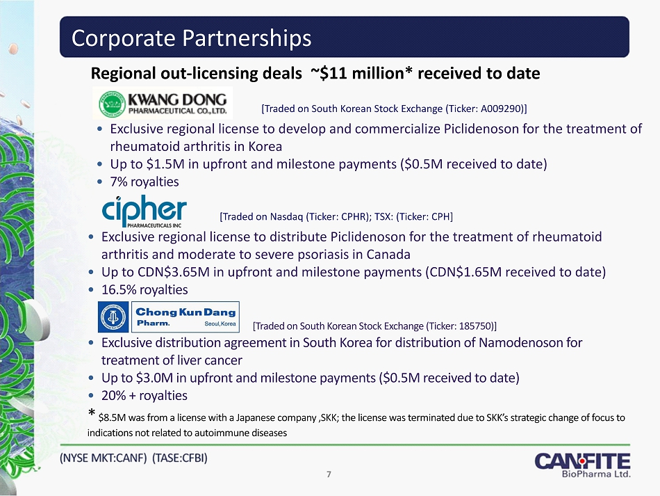 Drug Development Pipeline 6 Phase III protocol – IRB Submissions Phase III protocol - Reached Agreement with EMA On - going On - going IRB Submissions