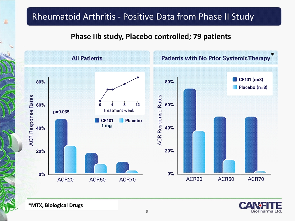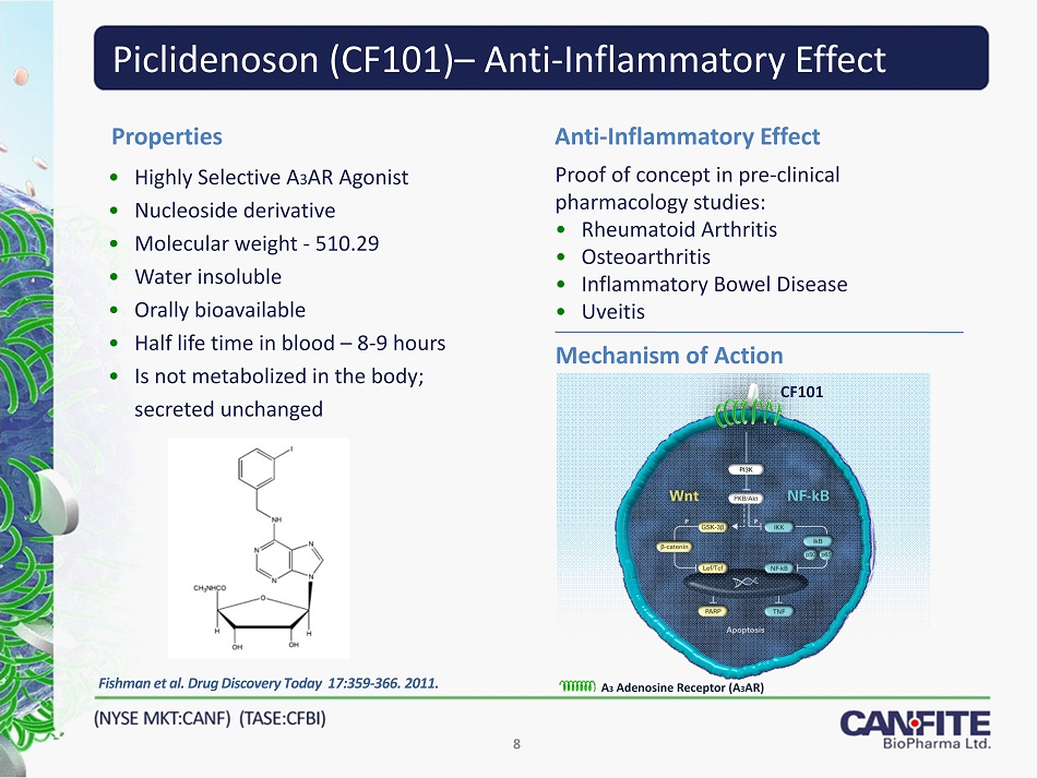 Piclidenoson (CF101) – Anti - Inflammatory Effect • Highly Selective A 3 AR Agonist • Nucleoside derivative • Molecular weight - 510.29 • Water insoluble • Orally bioavailable • Half life time in blood – 8 - 9 hours • Is not metabolized in the body; secreted unchanged Properties Proof of concept in pre - clinical pharmacology studies: • Rheumatoid Arthritis • Osteoarthritis • Inflammatory Bowel Disease • Uveitis Anti - Inflammatory Effect Mechanism of Action Fishman et al . Drug Discovery Today 17:359 - 366. 2011. CF101 A 3 Adenosine Receptor (A 3 AR) 8