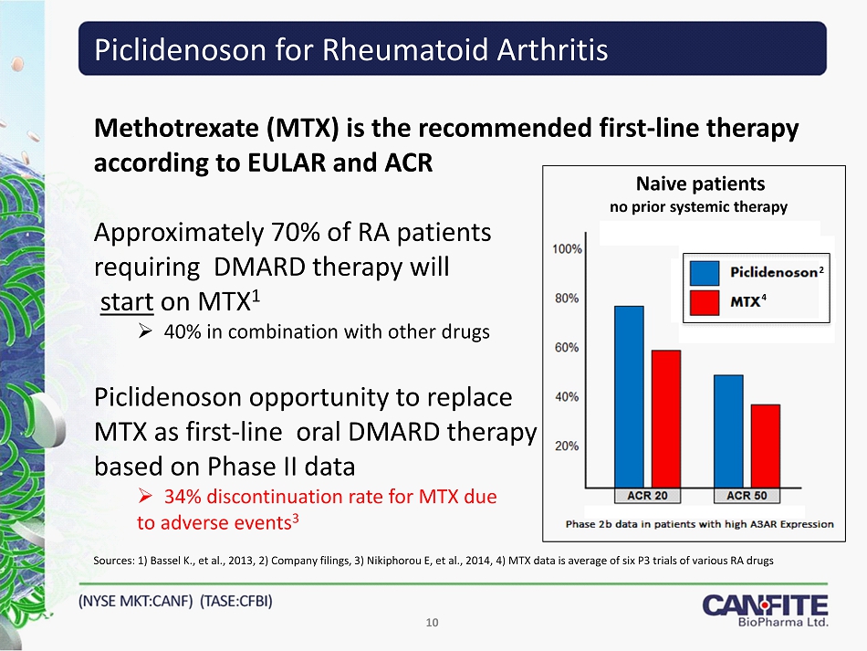 Phase IIb study, Placebo controlled; 79 patients Rheumatoid Arthritis - Positive Data from Phase II Study 9 *MTX, Biological Drugs *MTX, Biological Drugs 1 mg *