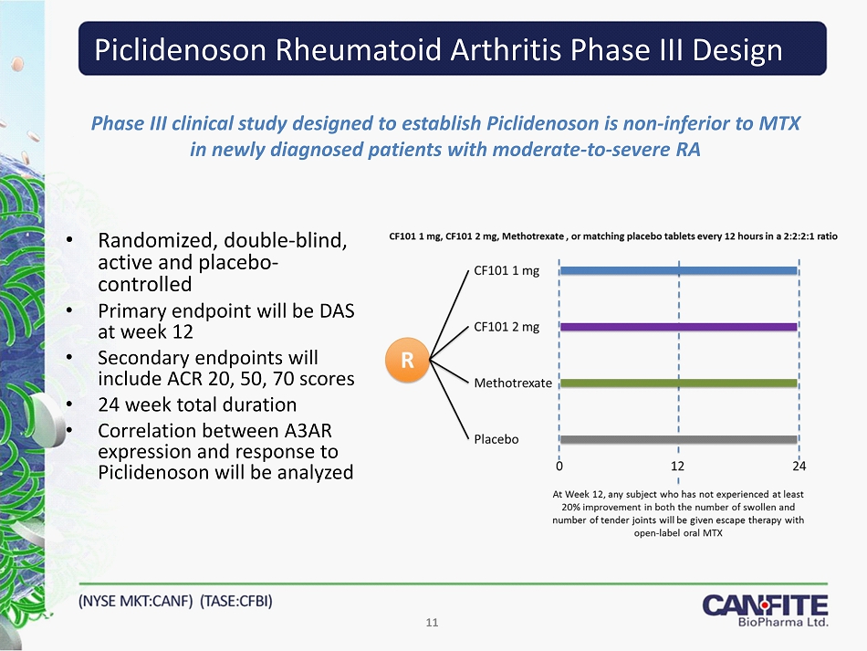 Naive patients no prior systemic therapy Piclidenoson for Rheumatoid Arthritis Methotrexate (MTX) is the recommended first - line therapy according to EULAR and ACR Approximately 70% of RA patients requiring DMARD therapy will start on MTX 1 » 40% in combination with other drugs Piclidenoson opportunity to replace MTX as first - line oral DMARD therapy based on Phase II data » 34% discontinuation rate for MTX due to adverse events 3 Sources: 1) Bassel K., et al., 2013, 2) Company filings, 3) Nikiphorou E, et al., 2014, 4) MTX data is average of six P3 trials of various RA drugs 10 4 2