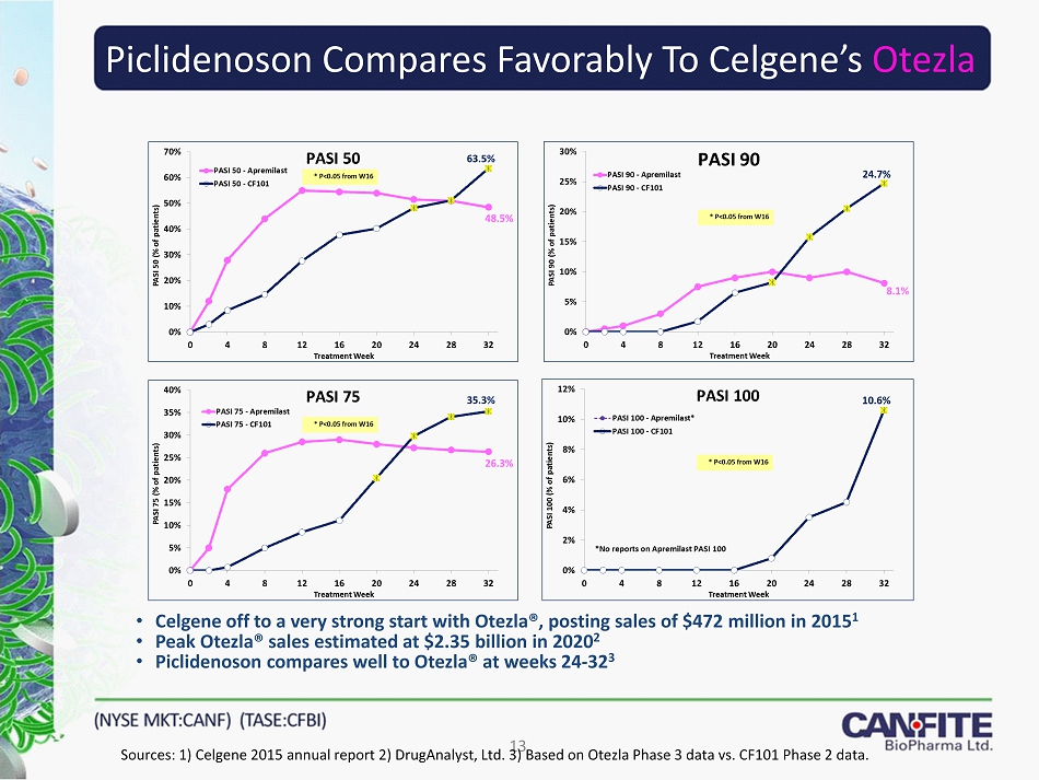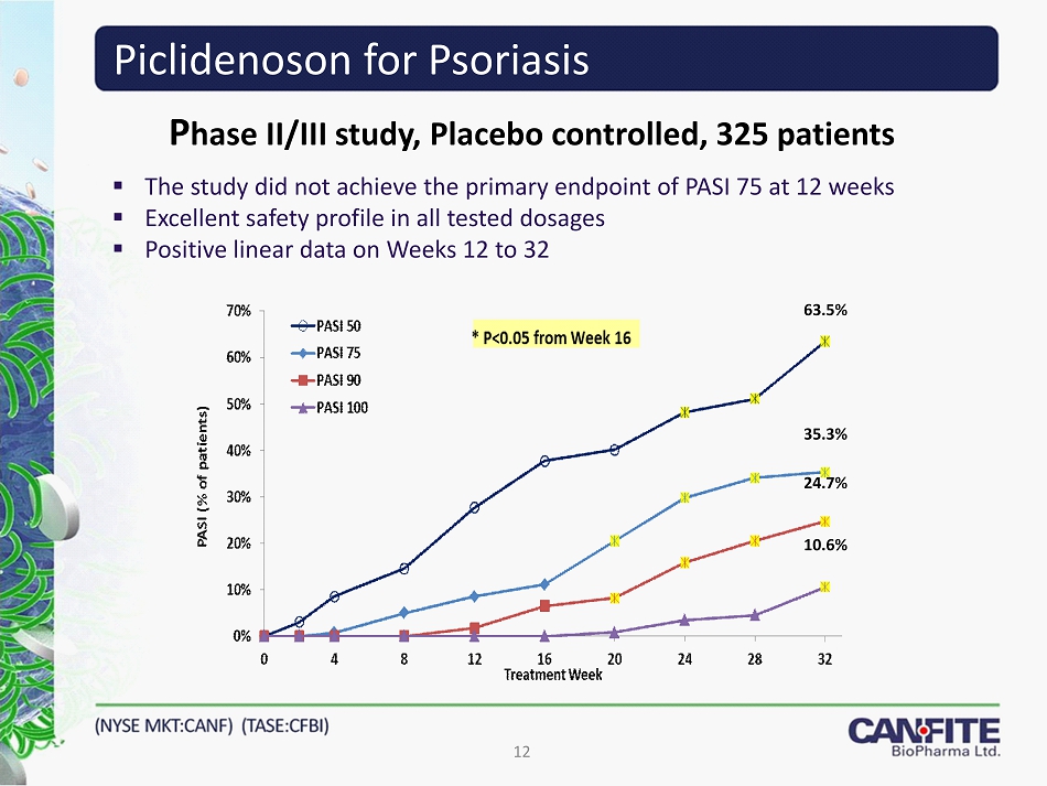▪ The study did not achieve the primary endpoint of PASI 75 at 12 weeks ▪ Excellent safety profile in all tested dosages ▪ Positive linear data on Weeks 12 to 32 Piclidenoson for Psoriasis 12 63.5% 35.3% 24.7% 10.6% P hase II/III study, Placebo controlled, 325 patients