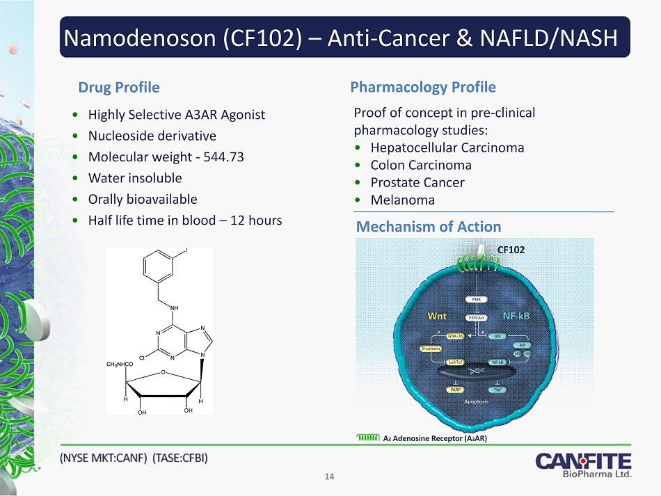 Piclidenoson Compares Favorably To Celgene’s Otezla 13 • Celgene off to a very strong start with Otezla®, posting sales of $ 472 million in 2015 1 • Peak Otezla® sales estimated at $ 2.35 billion in 2020 2 • Piclidenoson compares well to Otezla® at weeks 24 - 32 3 Sources: 1) Celgene 2015 annual report 2) DrugAnalyst , Ltd. 3) Based on Otezla Phase 3 data vs. CF101 Phase 2 data.