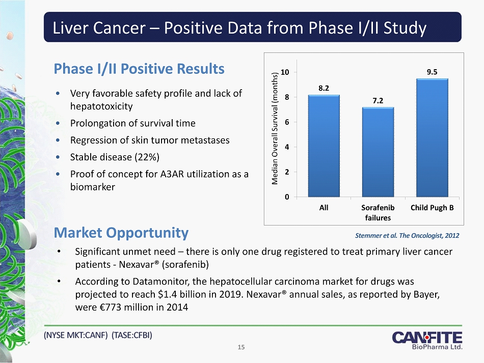 Namodenoson (CF102) – Anti - Cancer & NAFLD/NASH • Highly Selective A 3 AR Agonist • Nucleoside derivative • Molecular weight - 544.73 • Water insoluble • Orally bioavailable • Half life time in blood – 12 hours Drug Profile Proof of concept in pre - clinical pharmacology studies: • Hepatocellular Carcinoma • Colon Carcinoma • Prostate Cancer • Melanoma Pharmacology Profile Mechanism of Action CF 102 A 3 Adenosine Receptor (A 3 AR) 14