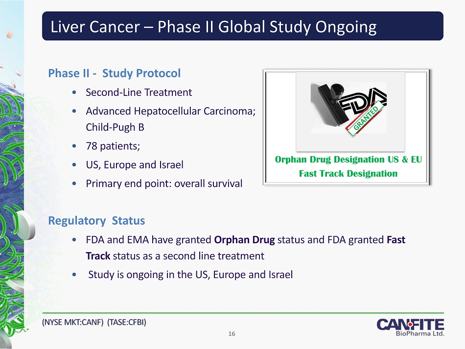 Liver Cancer – Positive Data from Phase I/II Study • Very favorable safety profile and lack of hepatotoxicity • Prolongation of survival time • Regression of skin tumor metastases • Stable disease (22%) • Proof of concept for A3AR utilization as a biomarker Market Opportunity 15 Phase I/II Positive Results • Significant unmet need – there is only one drug registered to treat primary liver cancer patients - Nexavar ® (sorafenib ) • According to Datamonitor , the hepatocellular carcinoma market for drugs was projected to reach $1.4 billion in 2019. Nexavar® annual sales, as reported by Bayer, were € 773 million in 2014 Stemmer et al. The Oncologist, 2012