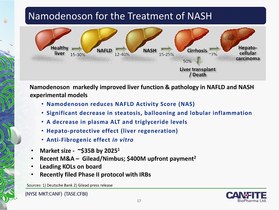 Phase II - Study Protocol • Second - Line Treatment • Advanced Hepatocellular Carcinoma; Child - Pugh B • 78 patients; • US, Europe and Israel • Primary end point: overall survival Regulatory Status • FDA and EMA have granted Orphan Drug status and FDA granted Fast Track status as a second line treatment • Study is ongoing in the US, Europe and Israel Liver Cancer – Phase II Global Study Ongoing 16 Orphan Drug Designation US & EU Fast Track Designation