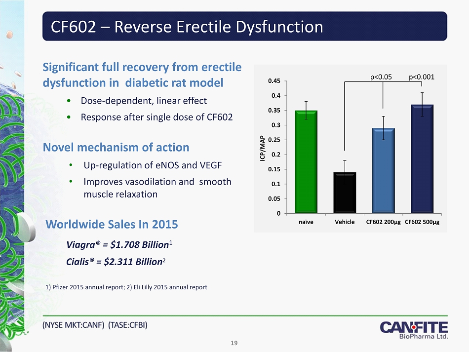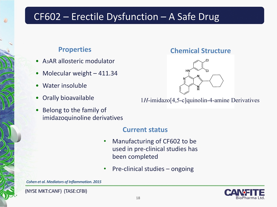 CF 602 – Erectile Dysfunction – A Safe Drug 18 Properties Cohen et al . Mediators of Inflammation. 2015 • A 3 AR allosteric modulator • Molecular weight – 411.34 • Water insoluble • Orally bioavailable • Belong to the family of imidazoquinoline derivatives Current status • Manufacturing of CF 602 to be used in pre - clinical studies has been completed • Pre - clinical studies – ongoing Chemical Structure 1 H - imidazo[ 4 , 5 - c]quinolin - 4 - amine Derivatives