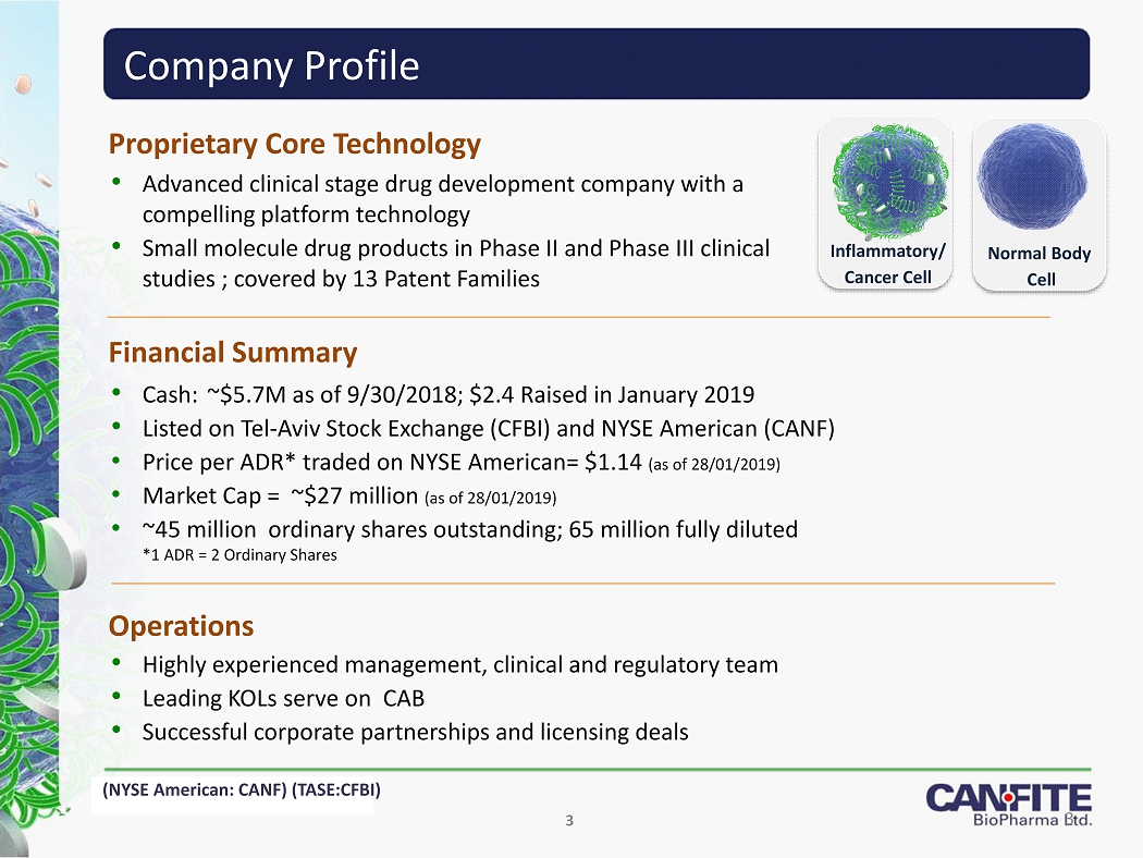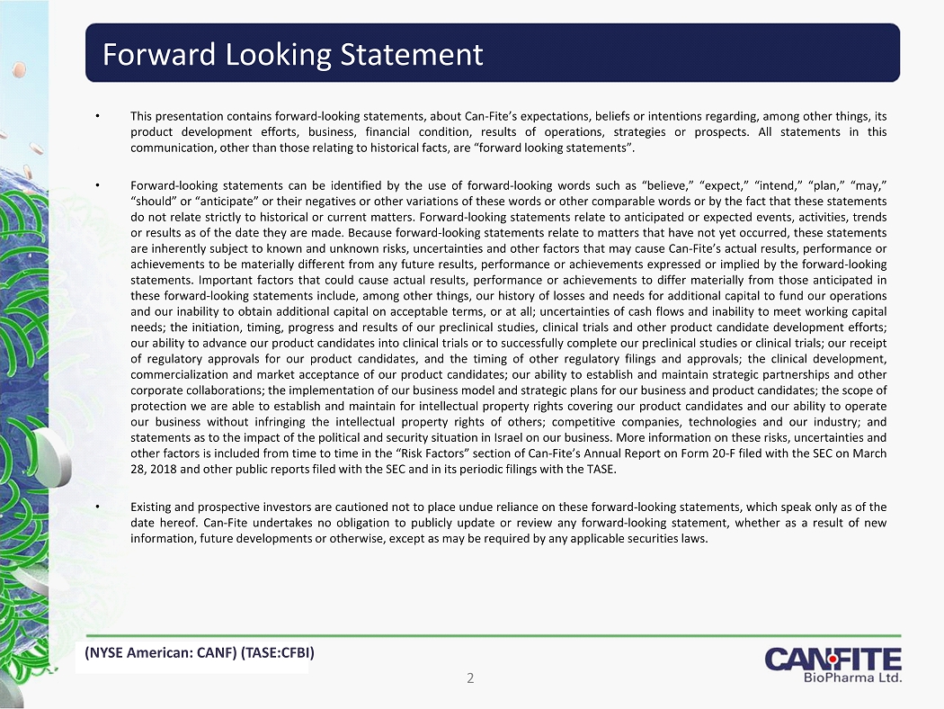 (NYSE American: CANF) (TASE:CFBI) Forward Looking Statement 2 • This presentation contains forward - looking statements, about Can - Fite’s expectations, beliefs or intentions regarding, among other things, its product development efforts, business, financial condition, results of operations, strategies or prospects . All statements in this communication, other than those relating to historical facts, are “forward looking statements ” . • Forward - looking statements can be identified by the use of forward - looking words such as “believe,” “expect,” “intend,” “plan,” “may,” “should” or “anticipate” or their negatives or other variations of these words or other comparable words or by the fact that these statements do not relate strictly to historical or current matters . Forward - looking statements relate to anticipated or expected events, activities, trends or results as of the date they are made . Because forward - looking statements relate to matters that have not yet occurred, these statements are inherently subject to known and unknown risks, uncertainties and other factors that may cause Can - Fite’s actual results, performance or achievements to be materially different from any future results, performance or achievements expressed or implied by the forward - looking statements . Important factors that could cause actual results, performance or achievements to differ materially from those anticipated in these forward - looking statements include, among other things, our history of losses and needs for additional capital to fund our operations and our inability to obtain additional capital on acceptable terms, or at all ; uncertainties of cash flows and inability to meet working capital needs ; the initiation, timing, progress and results of our preclinical studies, clinical trials and other product candidate development efforts ; our ability to advance our product candidates into clinical trials or to successfully complete our preclinical studies or clinical trials ; our receipt of regulatory approvals for our product candidates, and the timing of other regulatory filings and approvals ; the clinical development, commercialization and market acceptance of our product candidates ; our ability to establish and maintain strategic partnerships and other corporate collaborations ; the implementation of our business model and strategic plans for our business and product candidates ; the scope of protection we are able to establish and maintain for intellectual property rights covering our product candidates and our ability to operate our business without infringing the intellectual property rights of others ; competitive companies, technologies and our industry ; and statements as to the impact of the political and security situation in Israel on our business . More information on these risks, uncertainties and other factors is included from time to time in the “Risk Factors” section of Can - Fite’s Annual Report on Form 20 - F filed with the SEC on March 28 , 2018 and other public reports filed with the SEC and in its periodic filings with the TASE . • Existing and prospective investors are cautioned not to place undue reliance on these forward - looking statements, which speak only as of the date hereof . Can - Fite undertakes no obligation to publicly update or review any forward - looking statement, whether as a result of new information, future developments or otherwise, except as may be required by any applicable securities laws .