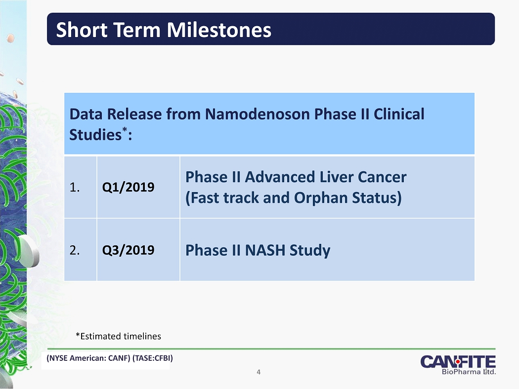 (NYSE American: CANF) (TASE:CFBI) 4 Short Term Milestones 4 Data Release from Namodenoson Phase II Clinical Studies * : 1. Q1/2019 Phase II Advanced Liver Cancer (Fast track and Orphan Status) 2. Q3/2019 Phase II NASH Study *Estimated timelines