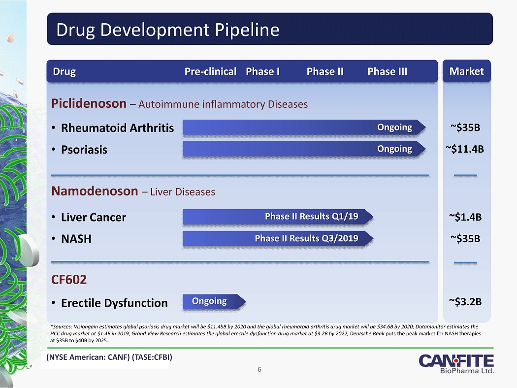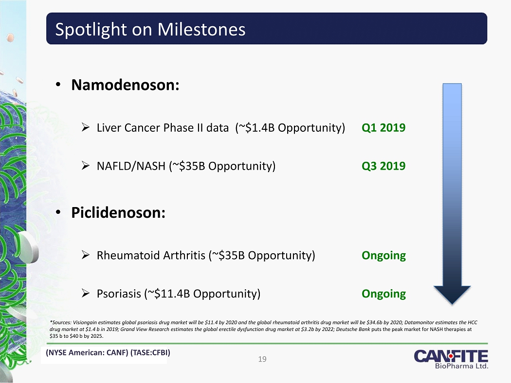 (NYSE American: CANF) (TASE:CFBI) Spotlight on Milestones 19 *Sources: Visiongain estimates global psoriasis drug market will be $ 11.4 by 2020 and the global rheumatoid arthritis drug market will be $ 34.6 b by 2020 ; Datamonitor estimates the HCC drug market at $ 1.4 b in 2019 ; Grand View Research estimates the global erectile dysfunction drug market at $ 3.2 b by 2022 ; Deutsche Bank puts the peak market for NASH therapies at $ 35 b to $ 40 b by 2025 . • Namodenoson: » Liver Cancer Phase II data (~$1.4B Opportunity ) Q1 2019 » NAFLD/NASH (~$35B Opportunity ) Q3 2019 • Piclidenoson: » Rheumatoid Arthritis (~$35B Opportunity ) Ongoing » Psoriasis (~$11.4B Opportunity ) Ongoing