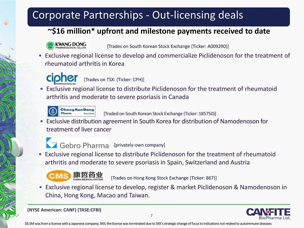 (NYSE American: CANF) (TASE:CFBI) [Trades on Hong Kong Stock Exchange (Ticker : 867 )] • Exclusive regional license to develop, register & market Piclidenoson & Namodenoson in China, Hong Kong, Macao and Taiwan. [ Trades on TSX : (Ticker : CPH)] • Exclusive regional license to distribute Piclidenoson for the treatment of rheumatoid arthritis and moderate to severe psoriasis in Canada [ Traded on South Korean Stock Exchange (Ticker: 185750)] • Exclusive distribution agreement in South Korea for distribution of Namodenoson for treatment of liver cancer [privately - own company] • Exclusive regional license to distribute Piclidenoson for the treatment of rheumatoid arthritis and moderate to severe psoriasis in Spain, Switzerland and Austria Corporate Partnerships - Out - licensing deals [Trades on South Korean Stock Exchange (Ticker : A 009290 )] • Exclusive regional license to develop and commercialize Piclidenoson for the treatment of rheumatoid arthritis in Korea 7 ~$ 16 million* upfront and milestone payments received to date $ 8.5M was from a license with a Japanese company, SKK; the license was terminated due to SKK’s strategic change of focus to in dic ations not related to autoimmune diseases
