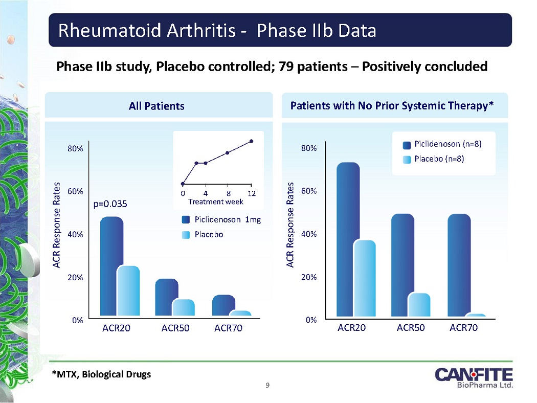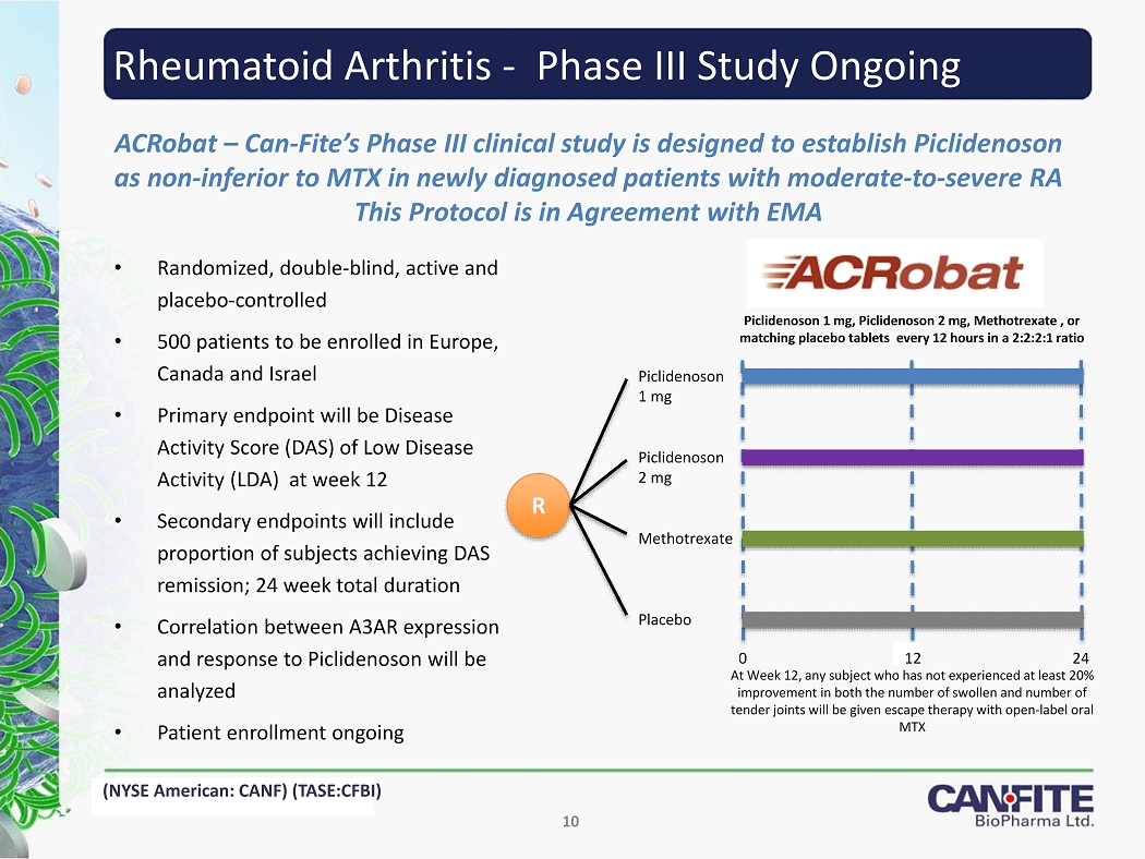 (NYSE American: CANF) (TASE:CFBI) Phase IIb study, Placebo controlled; 79 patients – Positively concluded Rheumatoid Arthritis - Phase IIb Data 9 *MTX, Biological Drugs *MTX, Biological Drugs 1 mg *
