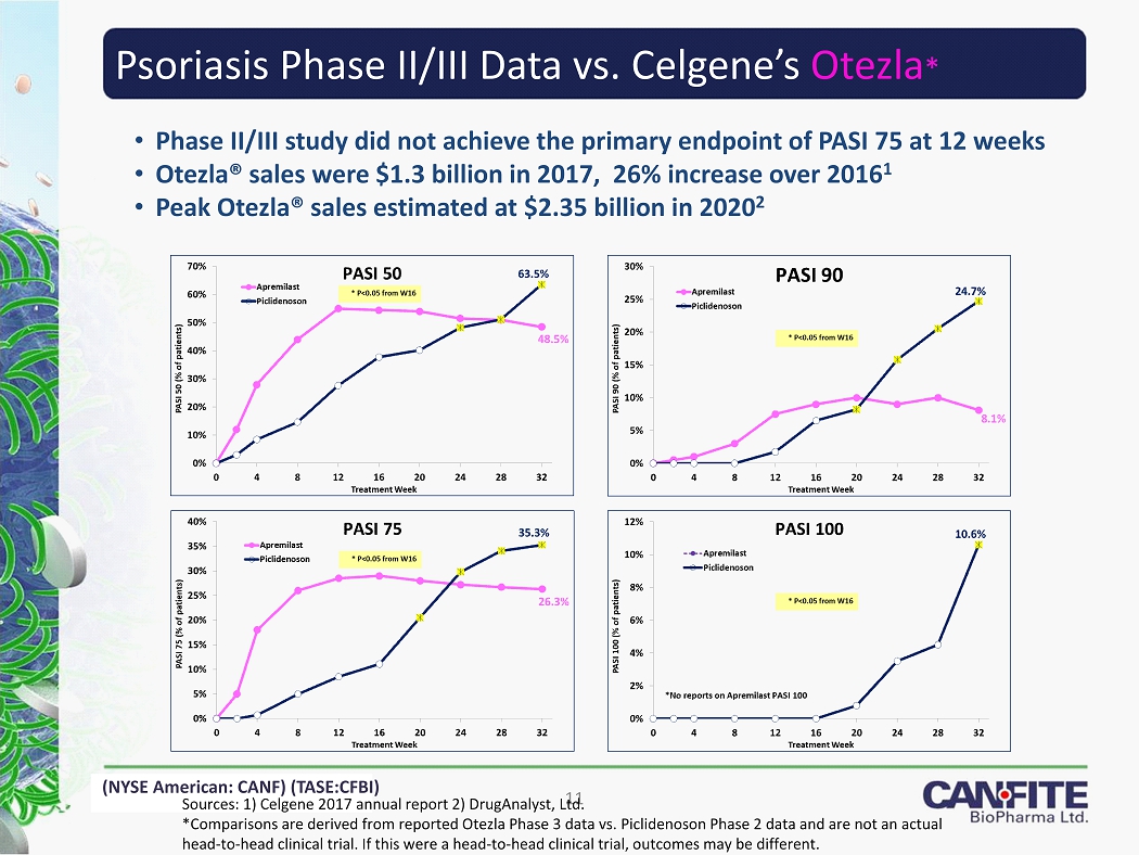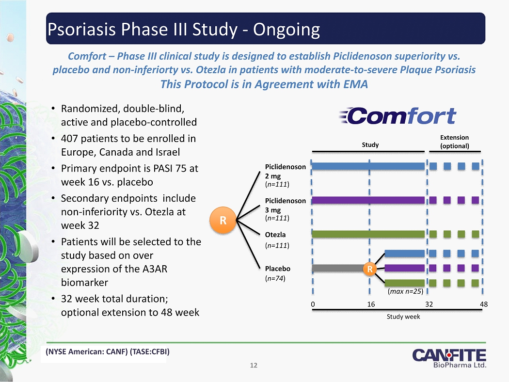 (NYSE American: CANF) (TASE:CFBI) Psoriasis Phase II/III Data vs. Celgene ’ s Otezla * 11 • Phase II/III study did not achieve the primary endpoint of PASI 75 at 12 weeks • Otezla ® sales were $ 1.3 billion in 2017, 26% increase over 2016 1 • Peak Otezla® sales estimated at $2.35 billion in 2020 2 Sources: 1) Celgene 2017 annual report 2) DrugAnalyst, Ltd. * Comparisons are derived from reported Otezla Phase 3 data vs. Piclidenoson Phase 2 data and are not an actual head - to - head clinical trial. If this were a head - to - head clinical trial, outcomes may be different .