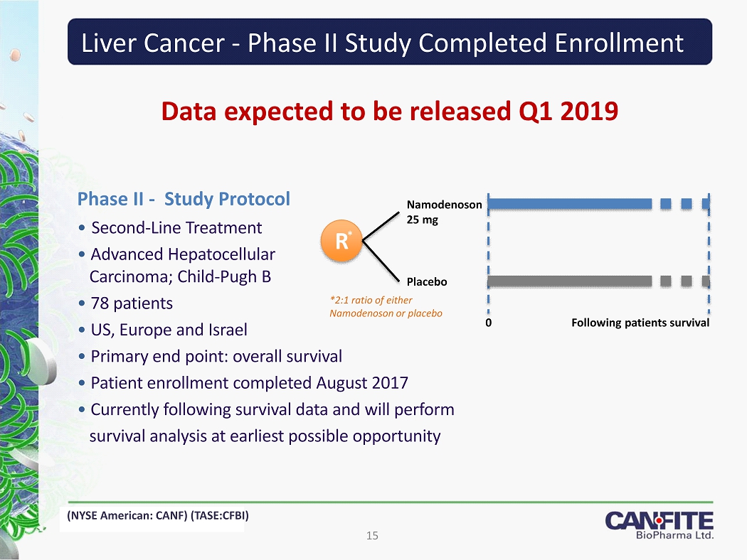 (NYSE American: CANF) (TASE:CFBI) Namodenoson for the Treatment of Liver Cancer • Excellent safety profile and lack of hepatotoxicity • Prolongation of survival time • Regression of skin tumor metastases • Stable disease (22 %) Regulatory Status 14 Phase I/II Positive Results Orphan Drug Designation US & EU Fast Track Designation • FDA and EMA have granted Orphan Drug status • FDA granted Fast Track status as a second line treatment * Da Fonseca LG et al, 2015; Safety and efficacy of sorafenib in patients with Child - Pugh B advanced hepatocellular carcinoma. Mol Clin Oncol. 2015 Jul;3(4):793 - 796 ma. *