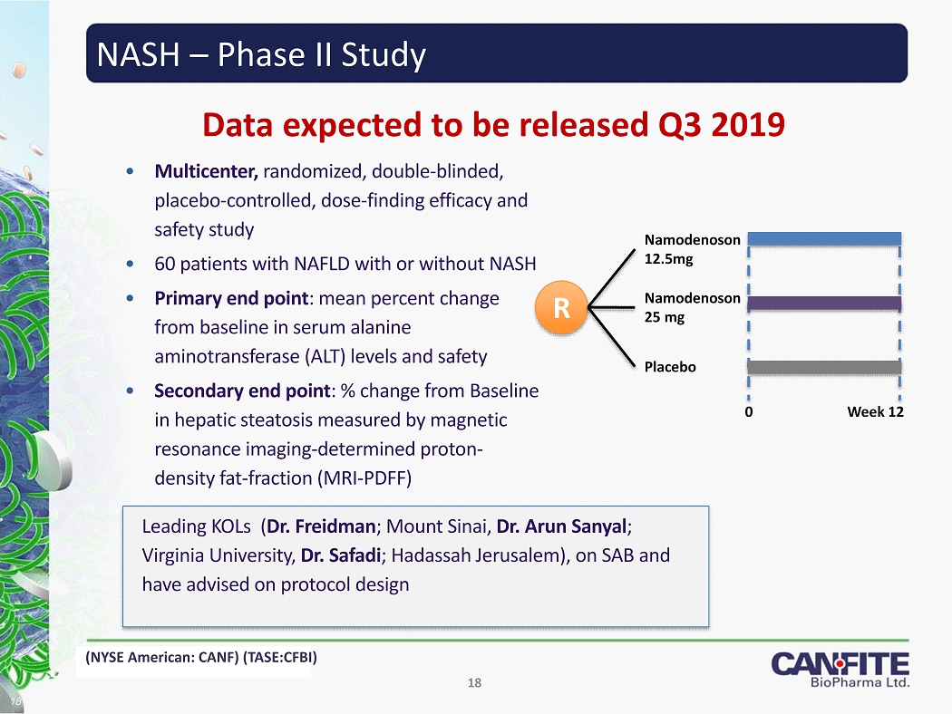 (NYSE American: CANF) (TASE:CFBI) NASH – Excellent Pre - clinical Data 17 Namodenoson markedly improved liver function & pathology in NASH experimental models (STAM & CCL4) x Anti - inflammatory - Namodenoson reduces NAFLD Activity Score (NAS) in STAM model x Anti - Fibrotic effect - in vitro and in the CCL 4 model x Anti steatotic effect - Significant decrease in steatosis, ballooning and lobular inflammation (STAM) x ALT - a decrease in plasma ALT and triglyceride levels (STAM & CCL 4 ) x Liver protective effect - Protects the liver against Ischemia/Reperfusion injury Robust Decrease in ALT