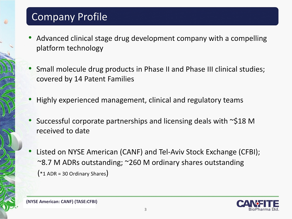 (NYSE American: CANF) (TASE:CFBI) Forward Looking Statement 2 • This presentation contains forward - looking statements, about Can - Fite’s expectations, beliefs or intentions regarding, among other things, its product development efforts, business, financial condition, results of operations, strategies or prospects . All statements in this communication, other than those relating to historical facts, are “forward looking statements” . • Forward - looking statements can be identified by the use of forward - looking words such as “believe,” “expect,” “intend,” “plan,” “may,” “should” or “anticipate” or their negatives or other variations of these words or other comparable words or by the fact that these statements do not relate strictly to historical or current matters . Forward - looking statements relate to anticipated or expected events, activities, trends or results as of the date they are made . Because forward - looking statements relate to matters that have not yet occurred, these statements are inherently subject to known and unknown risks, uncertainties and other factors that may cause Can - Fite’s actual results, performance or achievements to be materially different from any future results, performance or achievements expressed or implied by the forward - looking statements . Important factors that could cause actual results, performance or achievements to differ materially from those anticipated in these forward - looking statements include, among other things, our history of losses and needs for additional capital to fund our operations and our inability to obtain additional capital on acceptable terms, or at all ; uncertainties of cash flows and inability to meet working capital needs ; the initiation, timing, progress and results of our preclinical studies, clinical trials and other product candidate development efforts ; our ability to advance our product candidates into clinical trials or to successfully complete our preclinical studies or clinical trials ; our receipt of regulatory approvals for our product candidates, and the timing of other regulatory filings and approvals ; the clinical development, commercialization and market acceptance of our product candidates ; our ability to establish and maintain strategic partnerships and other corporate collaborations ; the implementation of our business model and strategic plans for our business and product candidates ; the scope of protection we are able to establish and maintain for intellectual property rights covering our product candidates and our ability to operate our business without infringing the intellectual property rights of others ; competitive companies, technologies and our industry ; and statements as to the impact of the political and security situation in Israel on our business . More information on these risks, uncertainties and other factors is included from time to time in the “Risk Factors” section of Can - Fite’s Annual Report on Form 20 - F filed with the SEC on April 2 , 2019 and other public reports filed with the SEC and in its periodic filings with the TASE . • Existing and prospective investors are cautioned not to place undue reliance on these forward - looking statements, which speak only as of the date hereof . Can - Fite undertakes no obligation to publicly update or review any forward - looking statement, whether as a result of new information, future developments or otherwise, except as may be required by any applicable securities laws .