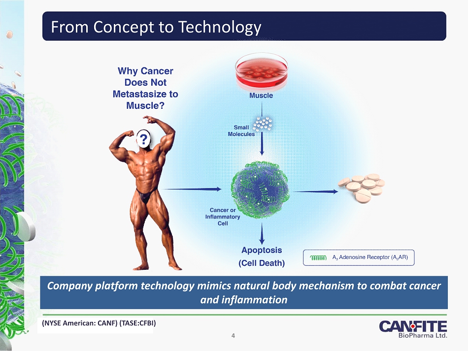 (NYSE American: CANF) (TASE:CFBI) From Concept to Technology 4 Company platform technology mimics natural body mechanism to combat cancer and inflammation
