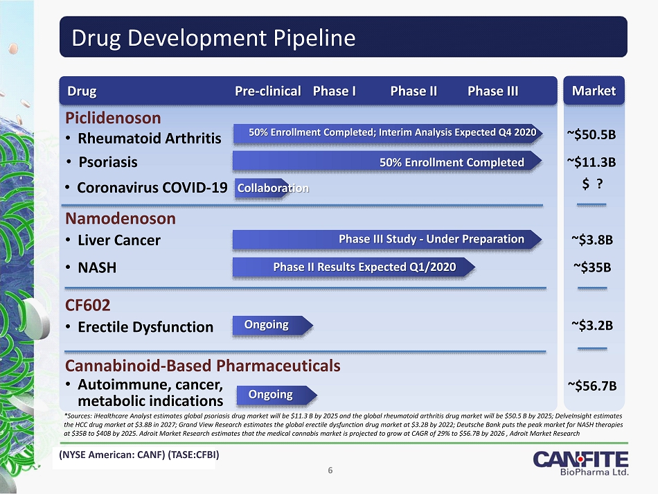 (NYSE American: CANF) (TASE:CFBI) Therapeutic Target • A 3 adenosine receptor (A 3 AR) • Highly expressed in inflammatory and cancer cells Drug product • Small molecules • Orally bioavailable drugs Therapeutic Effect • Anti - inflammatory and anti - cancer effects shown in Phase II studies; Excellent safety profile A 3 AR is utilized as a Predictive Biomarker • Utilized to predict patient’s response to the drug Platform Technology Targeted therapy, specifically aimed at diseased cells Inflammatory / Tumor Cells Normal Cells A 3 Adenosine Receptor (A 3 AR) 5
