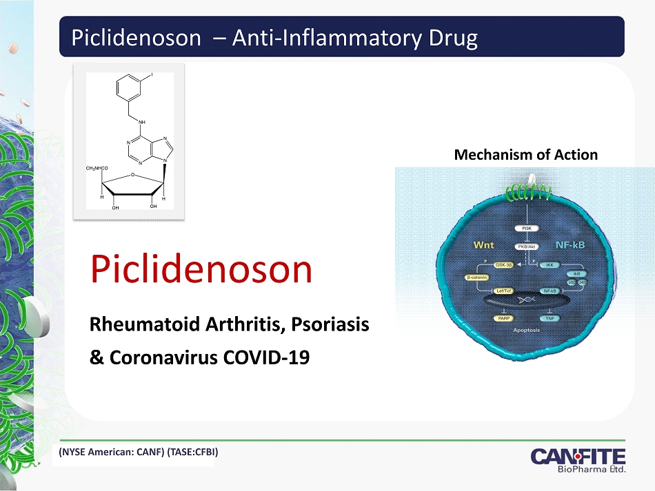 (NYSE American: CANF) (TASE:CFBI) 9 Piclidenoson Rheumatoid Arthritis, Psoriasis & Coronavirus COVID - 19 Piclidenoson – Anti - Inflammatory Drug Mechanism of Action