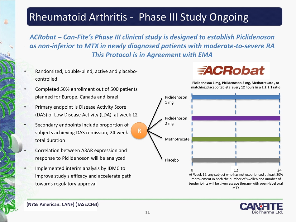 (NYSE American: CANF) (TASE:CFBI) Phase IIb study, Placebo controlled; 79 patients – Positively concluded Rheumatoid Arthritis - Phase IIb Data 10 *MTX, Biological Drugs *MTX, Biological Drugs Patients with No Prior Systemic Therapy* ACR20 ACR50 ACR 70 ACR Response Rates Placebo (n=8) Piclidenoson (n=8) All Patients ACR Response Rates p=0.035 ACR20 ACR 50 ACR70 Piclidenoson 1mg Placebo Treatment week 0 4 8 12 80% 60% 40% 20% 0% 80% 60% 40% 20% 0%