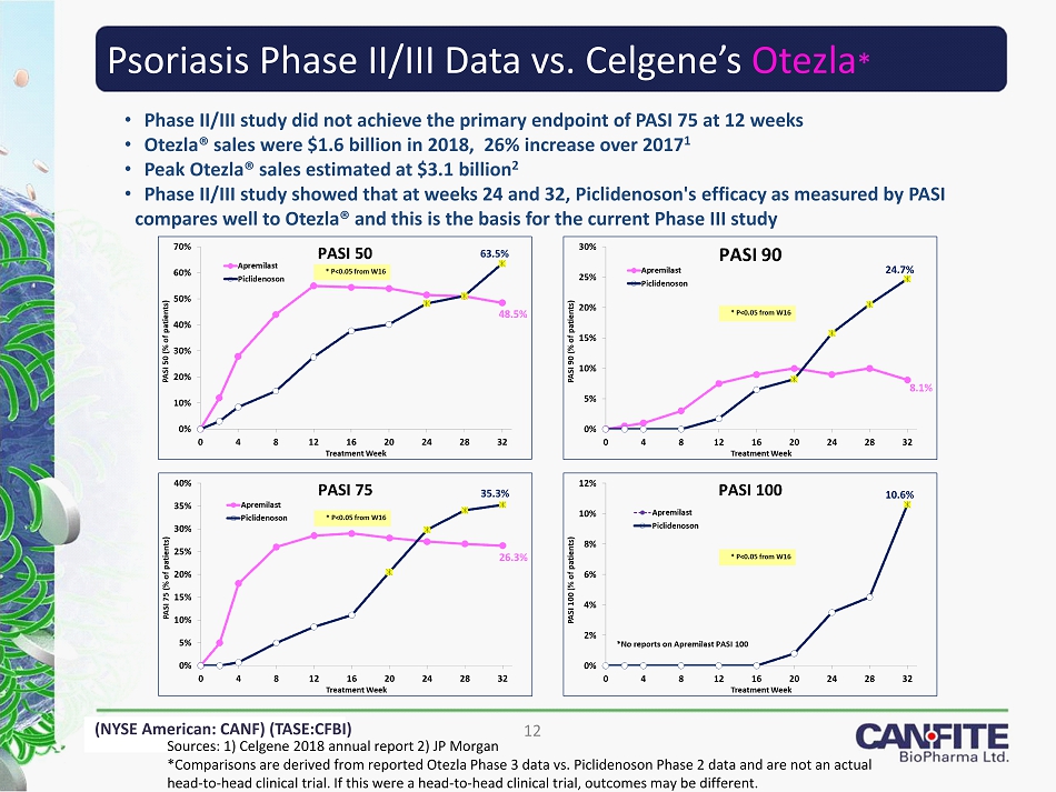 (NYSE American: CANF) (TASE:CFBI) Psoriasis Phase II/III Data vs. Celgene ’ s Otezla * 12 • Phase II/III study did not achieve the primary endpoint of PASI 75 at 12 weeks • Otezla® sales were $1.6 billion in 2018, 26% increase over 2017 1 • Peak Otezla® sales estimated at $3.1 billion 2 • Phase II/III study showed that at weeks 24 and 32, Piclidenoson's efficacy as measured by PASI compares well to Otezla® and this is the basis for the current Phase III study Sources: 1) Celgene 2018 annual report 2) JP Morgan *Comparisons are derived from reported Otezla Phase 3 data vs. Piclidenoson Phase 2 data and are not an actual head - to - head clinical trial. If this were a head - to - head clinical trial, outcomes may be different.
