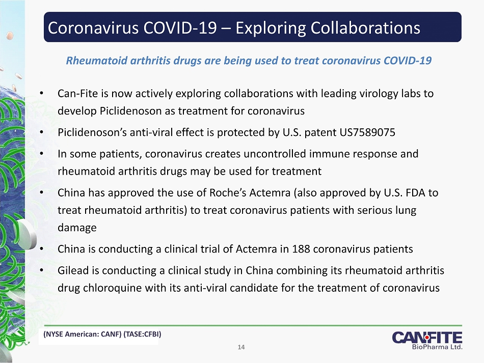 (NYSE American: CANF) (TASE:CFBI) Coronavirus COVID - 19 – Exploring Collaborations Rheumatoid arthritis drugs are being used to treat coronavirus COVID - 19 • Can - Fite is now actively exploring collaborations with leading virology labs to develop Piclidenoson as treatment for coronavirus • Piclidenoson’s anti - viral effect is protected by U.S. patent US7589075 • In some patients, coronavirus creates uncontrolled immune response and rheumatoid arthritis drugs may be used for treatment • China has approved the use of Roche’s Actemra (also approved by U.S. FDA to treat rheumatoid arthritis) to treat coronavirus patients with serious lung damage • China is conducting a clinical trial of Actemra in 188 coronavirus patients • Gilead is conducting a clinical study in China combining its rheumatoid arthritis drug chloroquine with its anti - viral candidate for the treatment of coronavirus 14