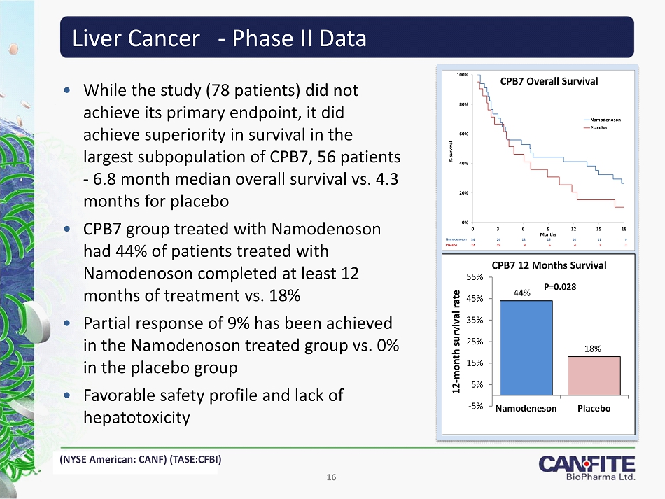(NYSE American: CANF) (TASE:CFBI) • While the study ( 78 patients) did not achieve its primary endpoint, it did achieve superiority in survival in the largest subpopulation of CPB 7 , 56 patients - 6.8 month median overall survival vs. 4.3 months for placebo • CPB 7 group treated with Namodenoson had 44 % of patients treated with Namodenoson completed at least 12 months of treatment vs. 18 % • Partial response of 9 % has been achieved in the Namodenoson treated group vs. 0 % in the placebo group • Favorable safety profile and lack of hepatotoxicity Liver Cancer - Phase II Data CPB7 Overall Survival 44% 18% -5% 5% 15% 25% 35% 45% 55% Namodeneson Placebo 12 - month survival rate CPB7 12 Months Survival P= 0.028 16