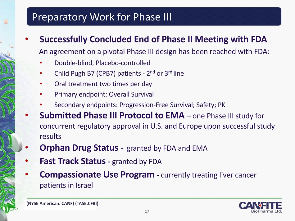 (NYSE American: CANF) (TASE:CFBI) • Successfully Concluded End of Phase II Meeting with FDA An agreement on a pivotal Phase III design has been reached with FDA: • Double - blind, Placebo - controlled • Child Pugh B7 (CPB7) patients - 2 nd or 3 rd line • Oral treatment two times per day • Primary endpoint: Overall Survival • Secondary endpoints: Progression - Free Survival; Safety; PK • Submitted Phase III Protocol to EMA – one Phase III study for concurrent regulatory approval in U.S. and Europe upon successful study results • Orphan Drug Status - granted by FDA and EMA • Fast Track Status - granted by FDA • Compassionate Use Program - currently treating liver cancer patients in Israel Preparatory Work for Phase III 17