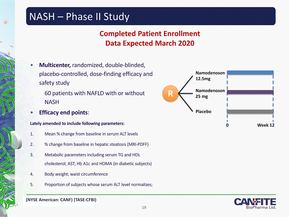 (NYSE American: CANF) (TASE:CFBI) NASH – Excellent Pre - clinical Data 18 Namodenoson markedly improved liver function & pathology in NASH experimental models (STAM & CCL4) x Anti - inflammatory - Namodenoson reduces NAFLD Activity Score (NAS) in STAM model x Anti - Fibrotic effect - in vitro and in the CCL 4 model x Anti steatotic effect - Significant decrease in steatosis, ballooning and lobular inflammation (STAM) x ALT - a decrease in plasma ALT and triglyceride levels (STAM & CCL 4 ) x Liver protective effect - Protects the liver against Ischemia/Reperfusion injury Robust Decrease in ALT
