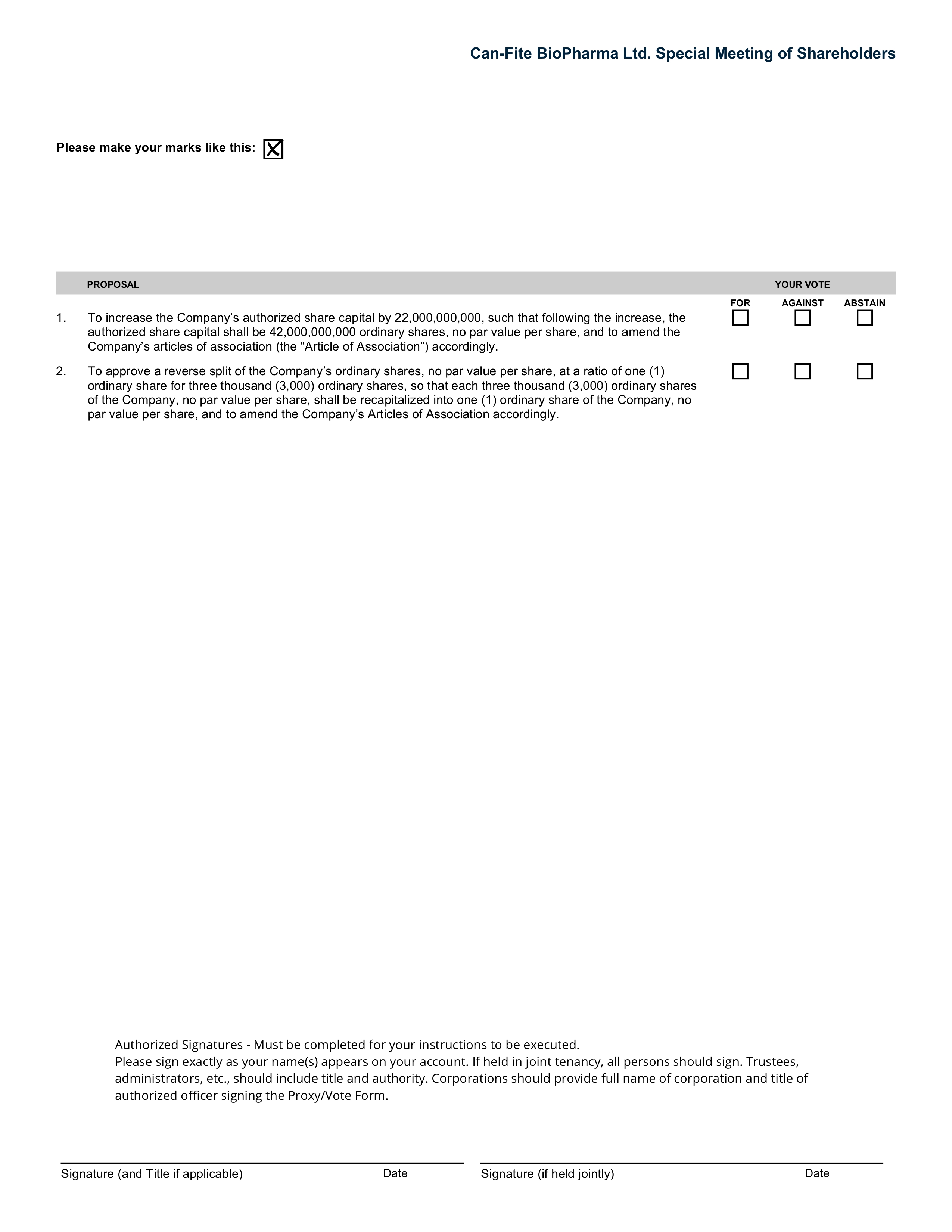 Can - Fite BioPharma Ltd. Special Meeting of Shareholders Please make your marks like this: YOUR VOTE PROPOSAL AGAINST ABSTAIN FOR 1. To increase the Company’s authorized share capital by 22,000,000,000, such that following the increase, the authorized share capital shall be 42,000,000,000 ordinary shares, no par value per share, and to amend the Company’s articles of association (the “Article of Association”) accordingly. 2. To approve a reverse split of the Company’s ordinary shares, no par value per share, at a ratio of one (1) ordinary share for three thousand (3,000) ordinary shares, so that each three thousand (3,000) ordinary shares of the Company, no par value per share, shall be recapitalized into one (1) ordinary share of the Company, no par value per share, and to amend the Company’s Articles of Association accordingly. Authorized Signatures - Must be completed for your instructions to be executed. Please sign exactly as your name(s) appears on your account. If held in joint tenancy, all persons should sign. Trustees, administrators, etc., should include title and authority. Corporations should provide full name of corporation and title of authorized officer signing the Proxy/Vote Form. Signature (and Title if applicable) Date Date Signature (if held jointly)