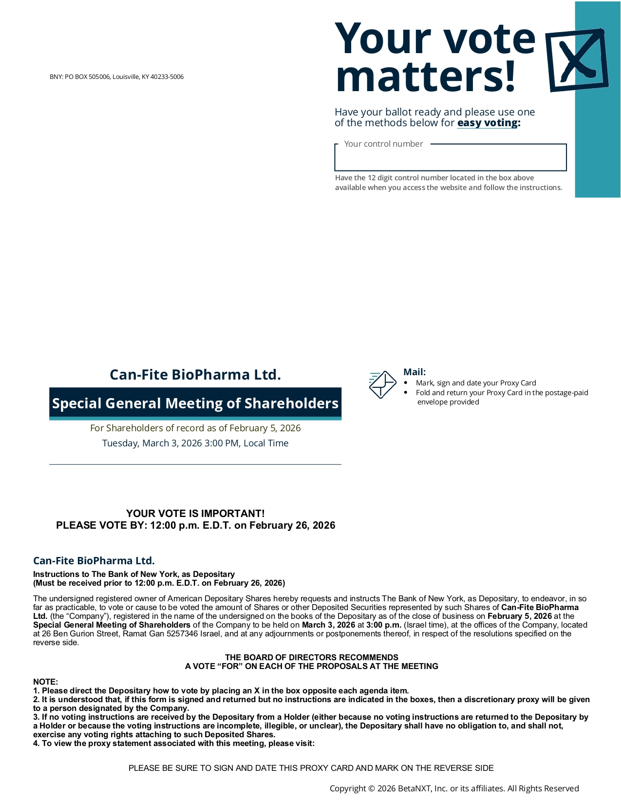 YOUR VOTE IS IMPORTANT! PLEASE VOTE BY: 12:00 p.m. E.D.T. on February 26, 2026 Can - Fite BioPharma Ltd. Instructions to The Bank of New York, as Depositary (Must be received prior to 12:00 p.m. E.D.T. on February 26, 2026) The undersigned registered owner of American Depositary Shares hereby requests and instructs The Bank of New York, as Depositary, to endeavor, in so far as practicable, to vote or cause to be voted the amount of Shares or other Deposited Securities represented by such Shares of Can - Fite BioPharma Ltd. (the “Company”), registered in the name of the undersigned on the books of the Depositary as of the close of business on February 5, 2026 at the Special General Meeting of Shareholders of the Company to be held on March 3, 2026 at 3:00 p.m. (Israel time), at the offices of the Company, located at 26 Ben Gurion Street, Ramat Gan 5257346 Israel, and at any adjournments or postponements thereof, in respect of the resolutions specified on the reverse side. THE BOARD OF DIRECTORS RECOMMENDS A VOTE “FOR” ON EACH OF THE PROPOSALS AT THE MEETING NOTE: 1. Please direct the Depositary how to vote by placing an X in the box opposite each agenda item. 2. It is understood that, if this form is signed and returned but no instructions are indicated in the boxes, then a discretionary proxy will be given to a person designated by the Company. 3. If no voting instructions are received by the Depositary from a Holder (either because no voting instructions are returned to the Depositary by a Holder or because the voting instructions are incomplete, illegible, or unclear), the Depositary shall have no obligation to, and shall not, exercise any voting rights attaching to such Deposited Shares. 4. To view the proxy statement associated with this meeting, please visit: PLEASE BE SURE TO SIGN AND DATE THIS PROXY CARD AND MARK ON THE REVERSE SIDE Copyright © 2026 BetaNXT, Inc. or its affiliates. All Rights Reserved Can - Fite BioPharma Ltd. Special General Meeting of Shareholders For Shareholders of record as of February 5, 2026 Tuesday, March 3, 2026 3:00 PM, Local Time BNY: PO BOX 505006, Louisville, KY 40233 - 5006 Mail: • Mark, sign and date your Proxy Card • Fold and return your Proxy Card in the postage - paid envelope provided Your vote matters! Have your ballot ready and please use one of the methods below for easy voting : Your control number Have the 12 digit control number located in the box above available when you access the website and follow the instructions.